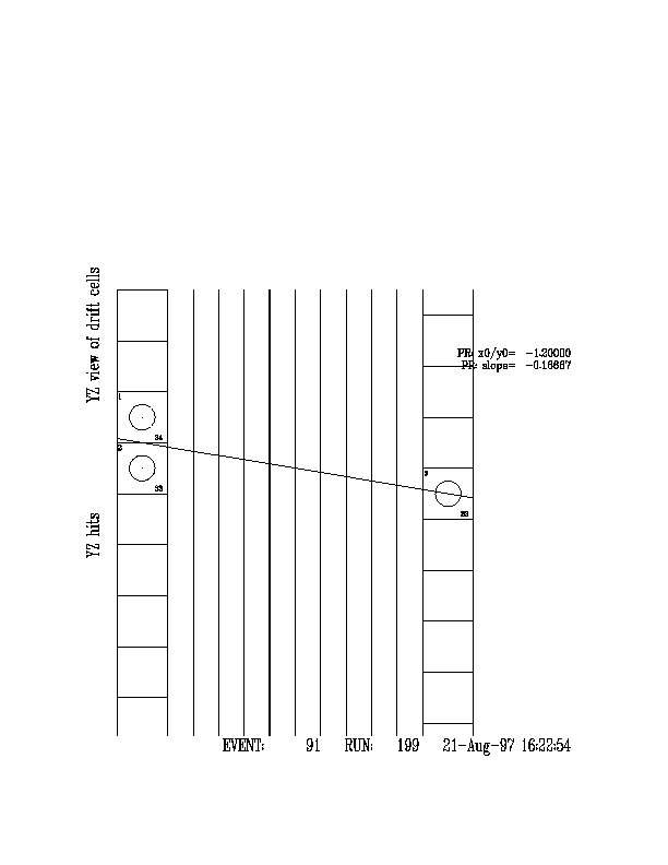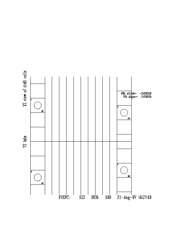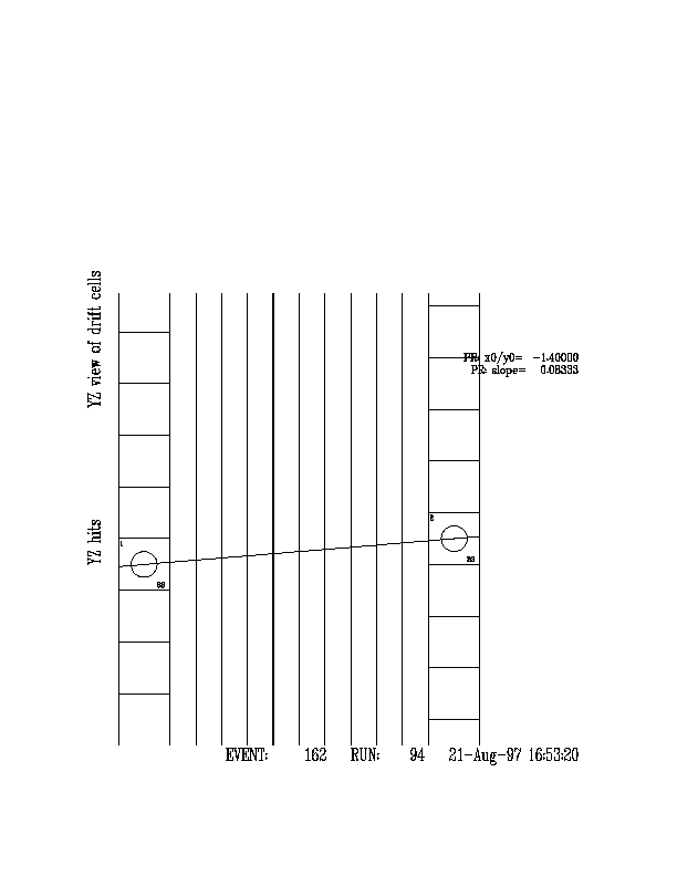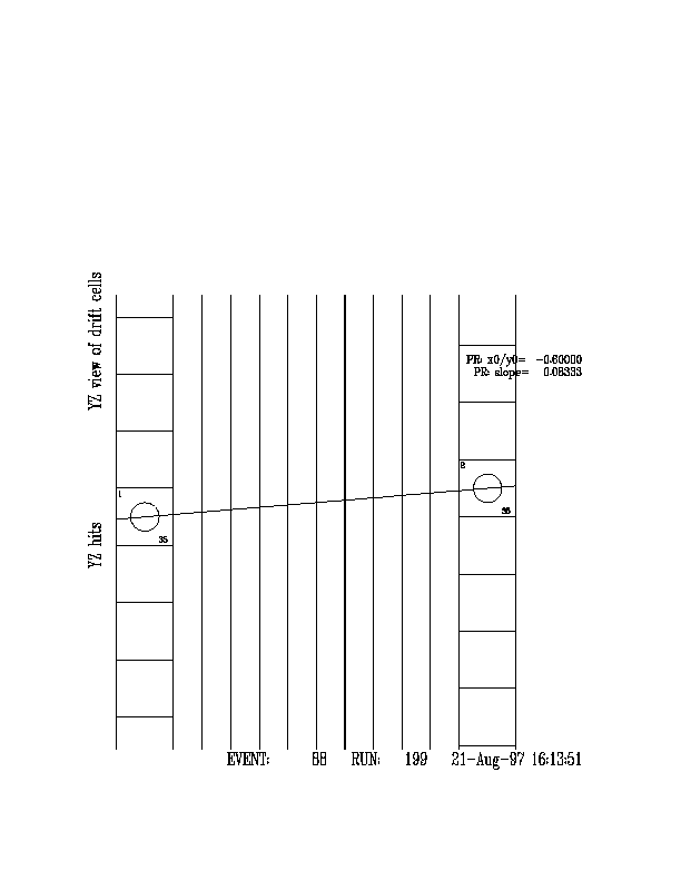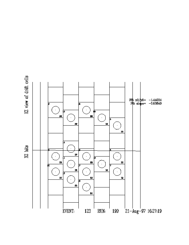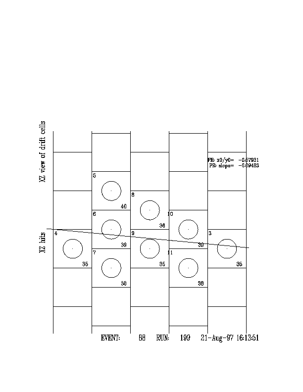 As one would expect crosstalk level for muons is much higher (10-20\%). Next figures show some typical tracks for 150 MeV/c pions (run 94) and 30 MeV/c muons (run 199) without any cuts applied. Circles on these pictures are for eye guidance only, and do not reflect real drift distances. Obviously, any reconstruction of muon tracks will not be very useful if crosstalk problem is not resolved.