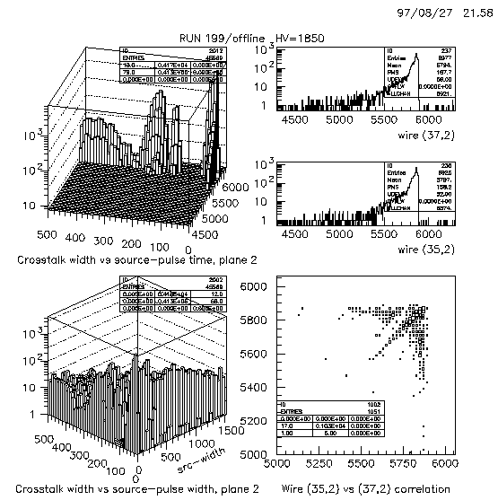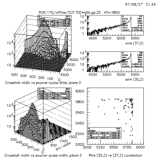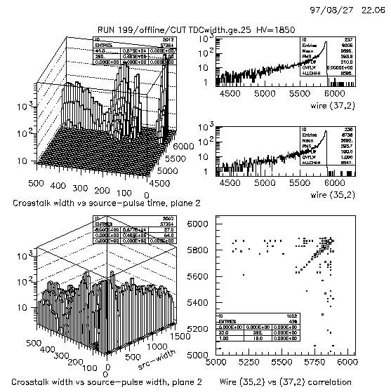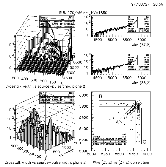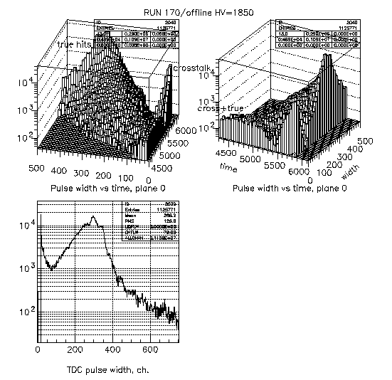 An attempt was made to exploit these correlations in further analysis. Most of crosstalk is caused by big pulses from tracks going close to wires and these true pulses tend to have large width. Another crosstalk feature is that it comes almost simultaneously with the source pulse. Two scatterplots on Fig.:run170cross-vs-source (upper and lower left) show the distribution of pulse widths in event (hits in all planes considered) arrived in coincidence ($\pm 10$ channels) with the longest pulse in plane 2.