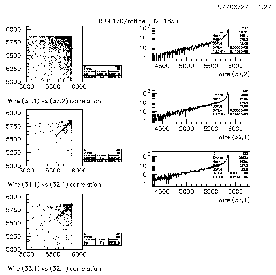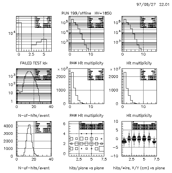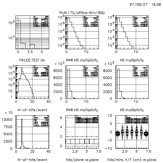 The lower-right plot on Fig.run170hits presents the beam profiles for all 7 (X and Y) planes.In this scatterplot each fired cell in event was counted only once even if there were multiple hits on wires. Number of hits in event distribution has a sharp peak at 7 (i.e. one hit per plane). Counts for number of hits less than 7 are not due to inefficiency of chamber - in most cases they come from tracks going close to the edges of instrumented wires (16 for Y-planes and 24 for X-planes).
